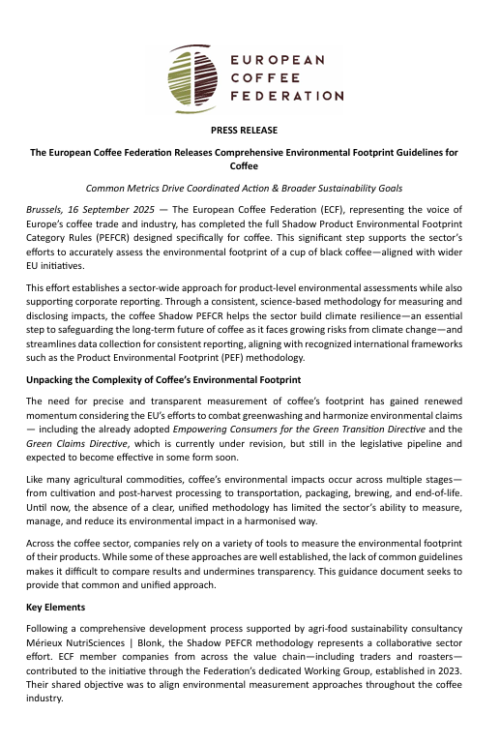 The European Coffee Federation Releases Comprehensive Environmental Footprint Guidelines for Coffee